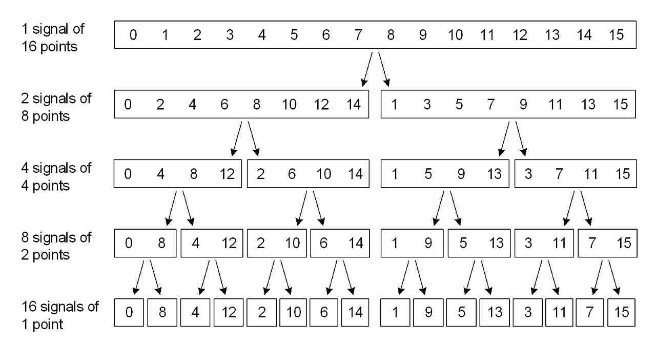 이러한 방법을 다시 재귀적으로 적용할 수 있다. N/2-Point DFT는 N/4-Point DFT로부터 구할 수 있으며, ..., 4-Point DFT는 2-Point DFT로부터 구할 수 있다.