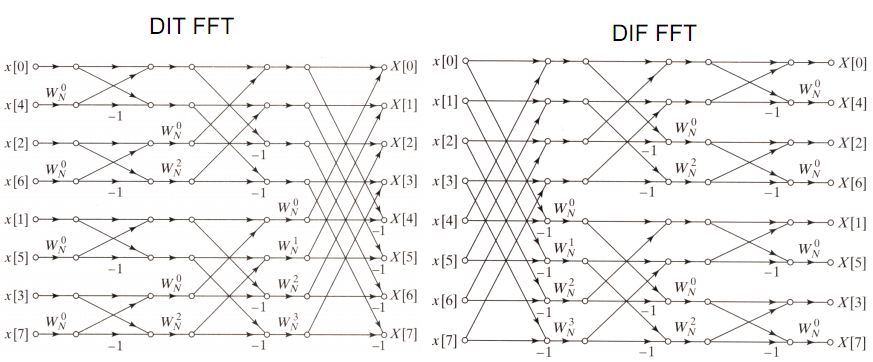반대로 frequency domain에서 위의 분해 과정을 진행할 수 있는데 이를 DIF(decimation in frequency)라고 부른다. 구현상으로는 DIT는 입력을 홀수항과 짝수항으로 절반을 나누고, DIF는 입력을 앞 절반의 항과 뒤 절반의 항으로 나누는 차이가 있다. DIT는 입력이 bit reversal이 되며, DIF는 출력이 bit reversal이 된다.